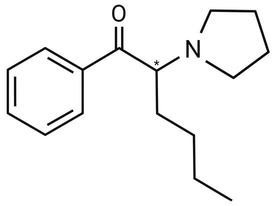 Regarding its chemical properties, α-PHP’s IUPAC name is 1-Phenyl-2-(pyrrolidine-1-yl)hexan-1-one and it has a molecular weight of 245.36 g/mol [62,63]. Its structure (C16H23NO) is composed of a hexanal bonded to a phenyl ring at position number 1, and to the nitrogen of a pyrrolidine ring at the position 2, and it has a chiral centre (*) in the α-carbon of the side chain, as illustrated in Figure 2 [19,64]. Moreover, the melting and boiling points are 108.90 °C and 339.06 °C, respectively, and the water solubility (25 °C) is established at 39.83 mg/L [19].
