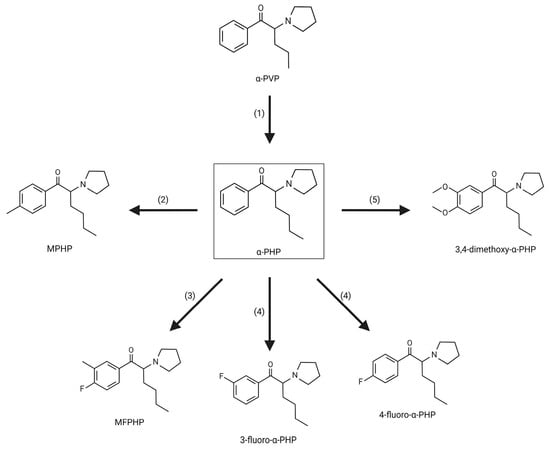- Paul, M.; Bleicher, S.; Guber, S.; Ippisch, J.; Polettini, A.; Schultis, W. Identification of Phase I and II Metabolites of the New Designer Drug α-Pyrrolidinohexiophenone (α-PHP) in Human Urine by Liquid Chromatography Quadrupole Time-of-Flight Mass Spectrometry (LC-QTOF-MS). J. Mass. Spectrom. 2015, 50, 1305–1317. [Google Scholar] [CrossRef] [PubMed]