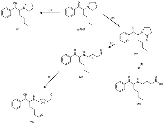α-PHP metabolites: M1—alcohol dihydro-α-PHP; M2—2”-keto-oxidized pyrrolidone derivate; M3—4-(1-oxo-1-phenylhexan-2ylamino)butanoic acid; M4—n-hydroxy-4-(1-oxo-1-phenylhexan-2-ylamino)butanal; M5—6-hydroxy-5-(n-hydroxy-4-oxobutylamino)-6-phenylhexanal. (1) β-keto reduction; (2) hydrolysation and oxidation; (3) pyrrolidine ring cleavage and oxidation; (4) pyrrolidine ring cleavage and hydroxylation; (5) oxidation/reduction.