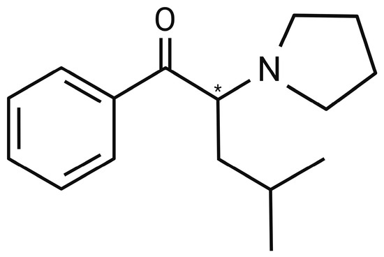 Even though they are isomers, some of the chemical properties of α-PiHP differ from those of α-PHP. Alpha-PiHP’s IUPAC name is 4-Methyl-1-phenyl-2-(pyrrolidine-1-yl)pentan-1-one, and its molecular weight is the same as that of the isomer (245.36 g/mol). Structurally, it has the same composition as α-PHP (C16H23NO) but with the methyl group shifted from position 5 to 6 of the side chain, as shown in Figure 5. In addition, as well as its isomer, its molecule has a chiral centre (*) located in the α-carbon of the side chain, which makes it possible for it to form an enantiomeric pair ((S)-α-PiHP and (R)-α-PiHP), and even if it is more likely to appear as a racemic mixture, their individual emergence cannot be excluded [23,25].