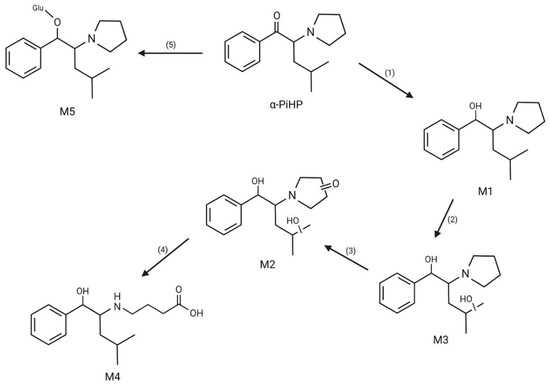 To date, the metabolism of αPiHP is not fully understood, so it is to be expected that it is related to its isomer, comprising the steps of β-keto group reduction and some oxidations and N-dealkylations [25]. In fact, eight phase I metabolites and two phase II metabolites have been identified so far. The most frequent metabolites found are those from phase I, the main two of which are formed by reduction of the β-keto group (M1) and by the combined oxidation of the pyrrolidine ring, aliphatic hydroxylation, and β-keto group reduction (M2). Three other metabolites, two phase I and one phase II, are also abundant and come from the combination of keto reduction and isoalkyl chain hydroxylation (M3), the cleavage of the ring and carboxylation (M4), and the glucuronidation of M1 (M5) [87]. All mentioned metabolites are included in Figure 6.