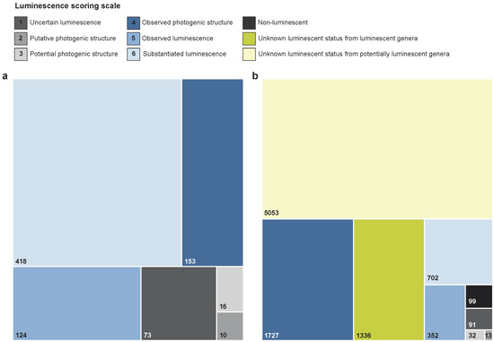 Proportional area chart showing the distribution of genera (a) and species (b) per luminescence score category (not including erroneous reports). The categories ‘Non luminescent’, ‘Unknown from luminescent genera’ and ‘Unknown from potentially luminescent genera’ are only relevant for panel b.