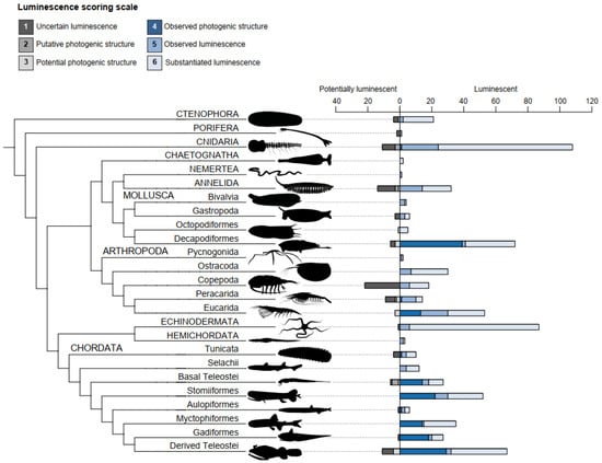 For many animal groups, the rise of molecular phylogenies enabled the evolutionary history of luminescence to be reconstructed, which was previously challenging because bioluminescence is a soft tissue-based process leaving no fossil clues [34,35,36,37,38,39]. Molecular phylogenetics also triggered a deep re-organization of marine animal systematics. Many species have been synonymized or moved to other genera (or even to higher taxonomic levels), subspecies have been erected as new species, subgenera have become new genera, and so on. All these elements have created additional confusion about the luminescence competence of a given species or genus. This, and the previously mentioned challenges in determining the luminescence status of a given species with certainty, might explain why—despite the paramount importance of animal luminescence for understanding marine ecology—there is currently no consolidated species-level list of luminescent marine animals available. Systematic studies on luminescence typically go no further than the genus-level [15,40] or they reach species-level but only for a relatively narrow taxonomic group [41,42,43,44,45,46].