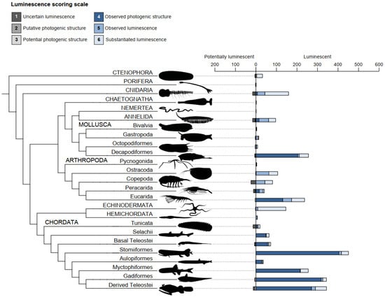 Generic distribution of luminescent marine animals. Capital letters are used for phylum-level groups while lower case labels are used for groups of lower taxonomic level. The bar chart next to the cladogram indicates the number of genera in each luminescence score category (not including erroneous reports). Luminescent genera encompass genera with at least one species displaying a luminescence score of 4 or above while potentially luminescent genera only have species with a luminescence score of 3 or below. ‘Basal Teleostei’ includes Alepocephaliformes, Anguilliformes, Argentiniformes, Clupeiformes, Nothacanthiformes and Saccopharyngiformes, while ‘Derived Teleostei’ includes Acanthuriformes (including Lophiiformes), Acropomatiformes, Batrachoidiformes, Beryciformes (including Trachicthyiformes), Eupercaria incertae sedis, Kurtiformes, Ophidiiformes and Scombriformes. Drawings by J.M. Claes.