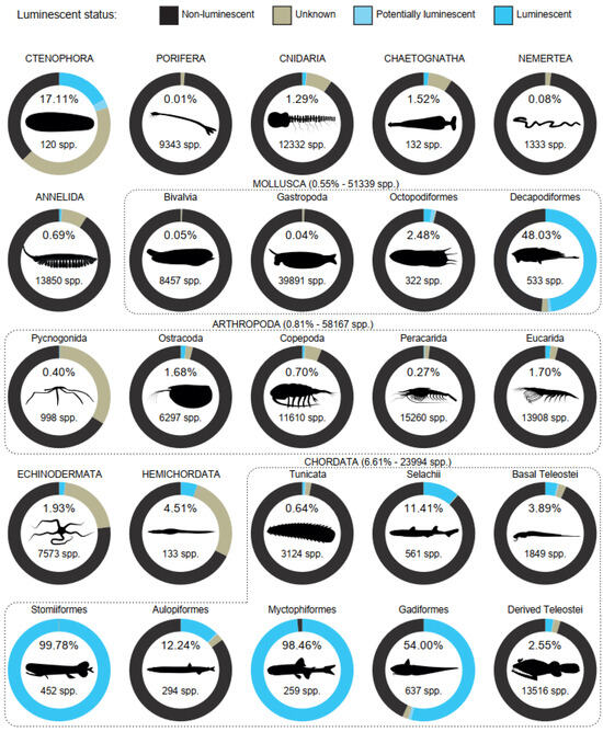 Luminescent species represent a small fraction (<5%) of the total number of valid species from most invertebrate groups, except in Decapodiformes and Ctenophora, where the number of luminescent species reaches 48.03% and 17.11%, respectively (Figure 4). Overall, marine Chordata (including marine Tetrapoda and Cephalochordata) display a proportion of luminescent species of 6.61% and contains a series of taxonomic groupings with higher luminescent species richness (e.g., Selachii and Aulopiformes), or where luminescent species prevail (Gadiformes) or are virtually ubiquitous (Stomiiformes and Myctophiformes). Species with unknown luminescent status from luminescent and potentially luminescent genera represent over 5.00% of some of the taxonomic groups such as Ctenophora (42.78%), Pycnogonida (33.47%), Hemichordata (27.07%), Echinodermata (21.02%), Cnidaria (8.19%), Annelida (8.15%), and Chaetognatha (7.58%).