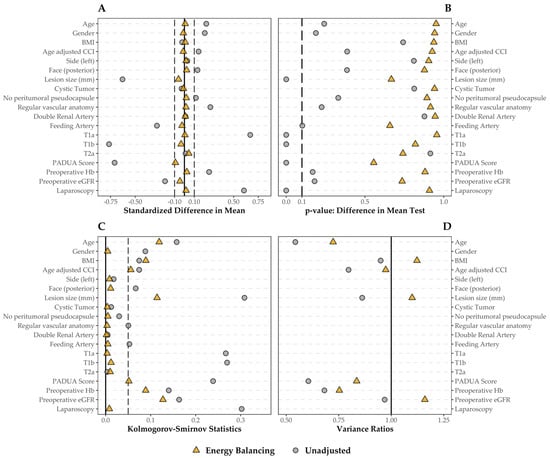 Covariate balance before and after the application of the EBW method; all the categorical covariates included were transformed, creating a binary variable for each category. (A) Standardized mean difference: values closer to 0 (solid line) have better balance, values between −0.1 and 0.1 (dashed line) are considered balanced. (B) p-value for a covariate-by-covariate t-test for the differences in means. (C) Kolmogorov–Smirnov statistics: the closer to 0 (solid line), the better the balancing, and the 0.05 threshold is indicated as well (dashed line). (D) Variance ratios only for numeric variables: optimal value is 1 (solid line), but a value below 2 is considered well balanced.