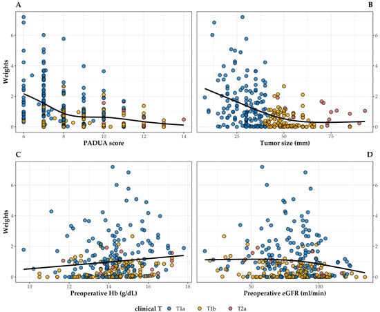 Association between weights assigned by the EBW procedure and PADUA score (A), tumor size (B), preoperative Hb (C), and preoperative eGFR (D) in patients in the on-clamp group classified by tumor T staging. The black line shows a smooth cubic spline curve.