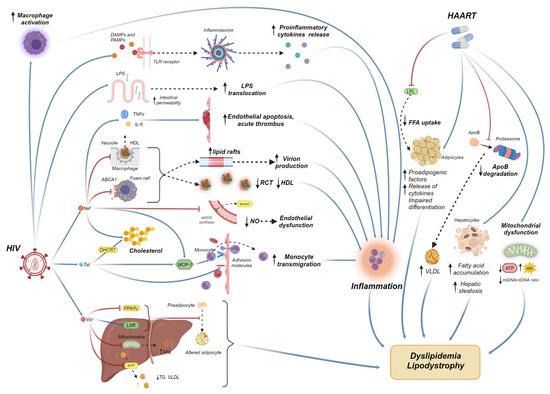 Inflammation plays a crucial role in dyslipidemia and associated atherosclerosis, serving both as a cause and as a consequence. In HIV infection, the subpopulation of CD14+/CD16+ pro-inflammatory monocytes predominates, as indicated by the increased ratio of CD4+/CD8+, expressing activation markers and molecules presenting antigens such as CD38, CD69, CD11b, and CD86, resulting in tissue migration and turnover to cholesterol-overloaded dysfunctional macrophages. These so-called foam cells found in adipose tissue, together with activated CD4 and CD8 T cells and NK and NKT cells, result in the production of inflammatory mediators such chemokines CCL2, CCL5 and CX3CL1, c-reactive protein (CRP), IL-6, IL-8, IL-1β, IL-18, IL-2, IFN-γ, IL-17A, and TNF-α, altering adipose cell function, impairing reverse cholesterol transport, and reducing HDL and apolipoprotein A-I (apoA-I) particle numbers [47,48,49,50,51,52]. Furthermore, these foam cells are highly concentrated in NADPH oxidases, enzymes that, under a hyperlipidemic environment, up-regulate and form oxLDL, inducing endoplasmic reticulum (ER) stress and the production of reactive oxygen species (ROS), exacerbating both inflammation and foam cell formation, which are strong promoters of atherogenesis [53,54,55]. Along the same line, another mechanism which promotes the ongoing inflammation in HIV-associated dyslipidemia is the activation of NLRP3 inflammasome. In fact, once pathogen-associated molecular patterns (PAMPs) and danger-associated molecular patterns (DAMPs) recognize HIV particles through toll-like receptors (TLRs), the formation of an inflammasome occurs, resulting in a cascade of cytokines and the further production of IL-1β and IL-18 [56,57]. Additionally, HIV infection is characterized by the production of interferon-alpha (IFN-α) as an attempt of the immune system to prevent viral entry and inhibit viral replication. Both IFN-α and TNF-α are associated with impaired oxidation of plasma FFAs, contributing to enhanced hepatic re-esterification and elevated plasma levels of TGs. Another important branch of inflammation-induced dyslipidemia is the alteration of the gut microbiome that occurs in HIV infection. In fact, damage to the intestinal epithelium, microbial translocation, and subsequent production of microbial metabolites and toxins such as lipopolysaccharide, along with the down-regulation of normal flora bioproducts such as butyrate, contribute to persistent inflammation, as measured by circulating soluble CD14 (sCD14), soluble CD163 (sCD163), and CRP, leading to an increased TG/HDL ratio [58,59,60,61,62].