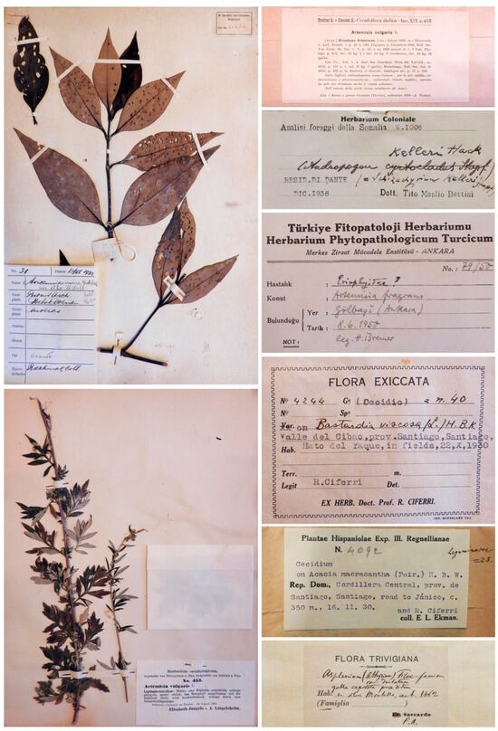 Examples of cecidological herbaria collected in the late 19th and early 20th centuries are shown in the figure. These herbaria are among the most studied worldwide for examining gall morphology and distribution in different countries and habitats. The specimens in the photographs are preserved at the Botanical Museum of the University of Padua, Italy.