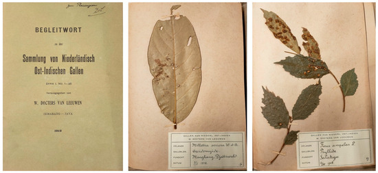 As confirmed in the first Supplement to The Zoocecidia of Netherlands’ East Indies [24,25], the study of gall biology was a significant focus of Willem Marius Docters van Leeuwen and Jenny Docters van Leeuwen-Reijnvaan during their permanence in the ‘Dutch East Indies’ (specifically, Central Java) from January 1908 to August 1932. Indeed, since 1912 Docters van Leeuwen compiled and published catalogues of galls from Java and other parts of the Malay Archipelago. Each folder contained 25 sheets of 18 × 28 cm, with specimens directly pinned to the sheet (Figure 2). A handwritten label provided information on the host plant, the gall-inducing organism, and the location/date of collection. The introductory booklet included a description of all samples with bibliographical references, drawings, and some photographs [27].