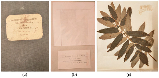 The Cecidotheca Fennica (or Suomalainen äkämäkokoelma) was compiled by the Finnish botanist Toivo Juho Hintikka (1888–1952) between 1911 and 1913. This collection, consisting of only 50 specimens organized in two folders, is of great interest as it provides a unique representation of the biodiversity of galls in Finland. Each gall is enclosed in a special paper envelope accompanied by a numbered label detailing the plant host, gall-inducing species, and sampling location (Figure 3). The folders are provided with two alphabetical indexes: one for host plants and the other for gall-inducing organisms. Galls are arranged systematically according to host plant taxonomy. In addition to his work on plant pathology, Hintikka is also renowned for his first revision of Finnish Myxomycetes and his exsiccate collection of 20 species of Myxomycetes (Myxogastres fennici exsiccati) [28].