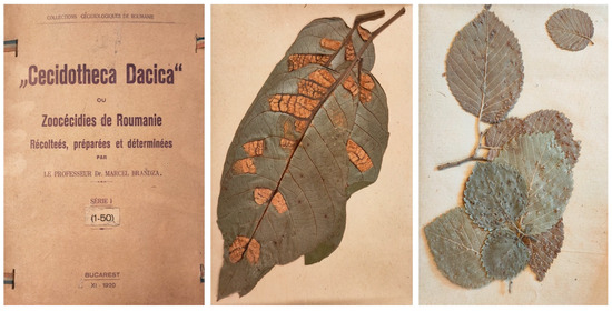 Differently from the previously described gall collections, the Cecidotheca Dacica, a zoocecidia herbarium compiled by the Romanian botanist Marcel Brândză (1868–1934), is organized by gall inducers rather than by host plant [29]. This herbarium, which is considered the first cecidological reference collection in Romania, consists of approximately 300 sheets, with specimens arranged in paper envelopes. Each sheet shows the inscription “Dr. M. Brândză, Cecidotheca Dacica” (Figure 4). Occasionally, specimens are marked as “Houard, Zoocecid. No…”, indicating the rank number of the species identified in Clodomir Houard’s catalogue [6], which Brândză used to verify his collection of gall-inducing species. Labels, in French, provided the name of the gall inducer, host plant, and place/date of collection. Samples were collected and identified by Brândză between November 1920 (series I, II, III, and IV) and April 1921 (series V and VI) [29].