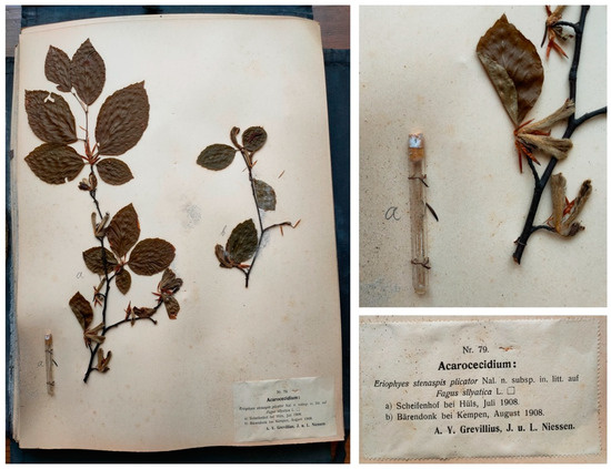 The Zoocecidia et Cecidozoa collection, compiled by Anders Yngve Grevillius and Josef Niessen, consists of separate specimens corresponding to the plant host (fixed on paper sheets) and the gall-forming organisms stored in vials. The photographed specimens are preserved at the Botanical Museum of the University of Padua, Italy.