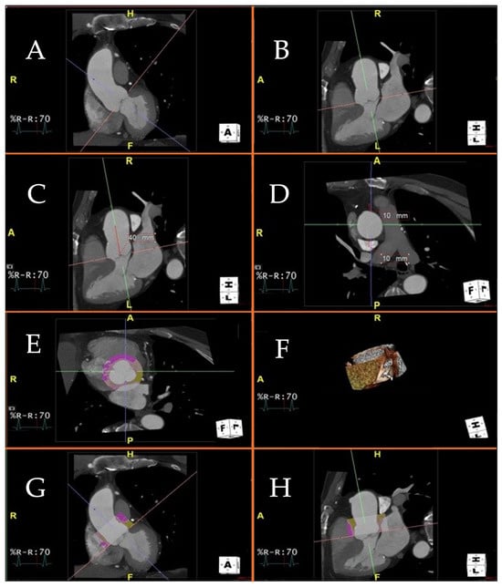 Figure 1 displays a visualization of the cardiac planes and ascending aorta using a 3D platform and the MultiPlanar Reconstruction (MPR) application. Specifically, the MPR mode enables accurate positioning of the cardiac viewing planes for the calculation of perivascular adipose tissue attenuation. Technical steps required to measure perivascular adipose tissue attenuation of the proximal ascending thoracic aorta on chest computed tomography angiography. (A–C): different projections of the ascending aorta and aortic valve. You can see the projections in two (A) and three (B,C) chambers, respectively; (D): axial visualization of the ascending aorta, at the pulmonary trunk; (E): Axial visualization of the aortic valve, at the three cusps, in diastolic phase. The colored circular section indicates the application of the software to measure perivascular adipose tissue attenuation of the proximal ascending thoracic aorta and aortic bulb; (F): Visualization volume rendering of the aortic bulb, at the origin of the coronary arteries; (G): Two-chamber visualization of the ascending aorta. Colored section indicates software application to measure perivascular adipose tissue attenuation of the proximal ascending thoracic aorta and aortic bulb; (H): Three-chamber visualization of the ascending aorta. Colored section indicates software application to measure perivascular adipose tissue attenuation of the proximal ascending thoracic aorta and aortic bulb.