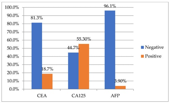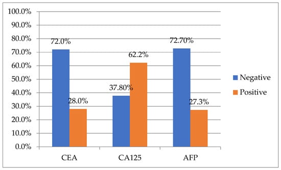 In the studied sample, 83.5% had CA 15-3 values greater than 32.4 U/mL. CEA values were below 10 ng/mL in 79.9% of the sample. Additionally, 56.8% of the sample had CA125 values exceeding 30.2 U/mL, and 93.0% had APF values at or below 8.1 ng/mL.
