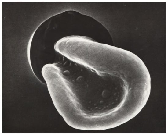 A red blood cell passing through a capillary under massive deformation (secondary electron microscopy, Dr. Hans Günther Roggenkamp [51]). magnification 1:1500.