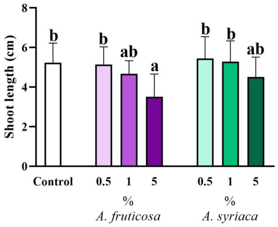 The allelopathic effect of leaf extracts at different concentrations of the two invasive plant species on the shoot length of Brassica napus after 14 days in a plant–soil system. Different letters indicate significant differences according to one-way ANOVA (p ≤ 0.05, data presented as mean ± SD, n = 15). “a” represents the most prominent group, “b” indicates milder differences. Columns marked with the same letter show no significant difference (the values of the significant differences can be found in Table S1).