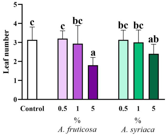 The allelopathic effect of leaf extracts at different concentrations of the two invasive plant species on the leaf number of Brassica napus after 14 days in a plant–soil system. Different letters indicate significant differences according to one-way ANOVA (p ≤ 0.05, data presented as mean ± SD, n = 15). “a” represents the most prominent group, “b” indicates milder differences, while “c” signifies another group. Columns marked with the same letter show no significant difference (the values of the significant differences can be found in Table S1).