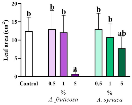 The allelopathic effect of leaf extracts at different concentrations of the two invasive plant species on the leaf area of Brassica napus after 14 days in a plant–soil system. Different letters indicate significant differences according to one-way ANOVA (p ≤ 0.05, data presented as mean ± SD, n = 15). “a” represents the most prominent group, “b” indicates milder differences. Columns marked with the same letter show no significant difference (the values of the significant differences can be found in Table S1).