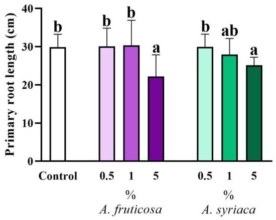 The 14-day cultivation in rhizotrons allowed for the investigation of the allelopathic effects on the root system and its non-invasive measurement (Figure S1). Among these measurements, we first observed the effect of allelopathy on the primary root length, as shown in Figure 5. Similar to the above-ground morphological features, no significant differences were found in the case of 0.5 and 1% applications of ground leaves of invasive species in terms of primary root length, compared to the control. However, a significant inhibition of primary root elongation was observed in the 5% treatments compared to both the control and the lower concentrations. The 5% treatment with false indigo-bush exerted a significant inhibitory effect on the primary root length compared to the control and the other treatments. The 5% treatment with milkweed significantly inhibited primary root growth compared to the control and the 0.5% treatment, while it did not significantly inhibit growth compared to the 1% treatment (Figure 5). While there were no significant differences between treatments of the two species at the same concentration, significant differences were observed among different concentrations. Significant differences were also observed between the 5% treatment of false indigo-bush and the 0.5% treatment of milkweed. Moreover, there were significant differences between the 5% treatment of milkweed and the 0.5% and 1% treatments of false indigo-bush as well (Figure 5).