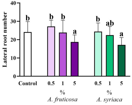 The allelopathic effect of leaf extracts at different concentrations of the two invasive plant species on the number of lateral roots of Brassica napus after 14 days in a plant–soil system. Different letters indicate significant differences according to one-way ANOVA (p ≤ 0.05, data presented as mean ± SD, n = 15). “a” represents the most prominent group, “b” indicates milder differences. Columns marked with the same letter show no significant difference (the values of the significant differences can be found in Table S2).