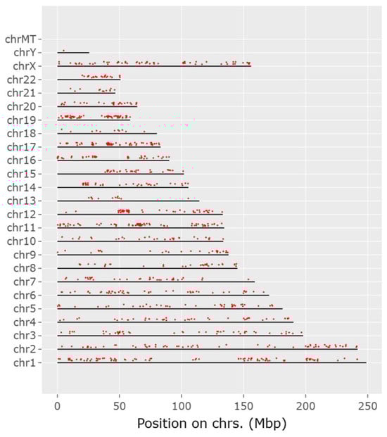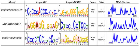 The CACCC-box motif was initially searched using Signal Search Analysis Server (SSAS) at 150 bp upstream and 300 bp downstream of transcription start sites (TSS) 5′-TATA(A/T)A(A/T)-3′(CACCC-regions-), and Genome Reference Consortium Human Build 38 Organism: Homo sapiens (GRCh38) was used as reference. The results obtained a total of 3044 hits for the CACCC-box with 40 diverse matrices regions. Figure 1 shows the three highest representative core matrix regions found encompassing the core CACCC-box. CCCCCACCCCCAC(C/T) sequence was found in 67.5% of the CACCC-regions with a score value of 7.8 × 10−12; next, CTCCCCCTCCT was found in 72.5% of the regions and with a score value of 6.9 × 10−9; and finally, the sequence CCCCTCC(C/T)(C/T)CCTC was found in 62.5% of the regions and with a score of 3.2 × 10−6. Additional sequences can be found in Supplementary Table S1. Moreover, Figure 2 shows a representative diagram for each chromosome, denoting CACCC-box binding (red marks) for identifiable genes. Out of 3044 potential hits, these included nonsense repeats, as well as non-transcription starting points; 1174 hits were related to identifiable genes.