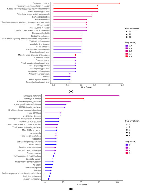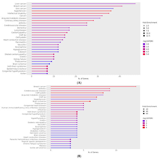 ShinyGO enrichment analysis of CACCC-box involvement in diseases: (A) Complete set; (B) KLF specific interactions. The horizontal plane correlates to the number of genes involved per disease. Fold enrichment and false discovery rate (FDR) apply to the integrated data to resolve for differentially confirmed genes indicating overrepresentation within the disease. Fold enrichment directly relates to gene target confirmation. FDR relates to the expected number of positive or significant classifications. Color lines represent FDR weight; blue represents the least statistical significance and red the highest statistical significance. Additionally, line thickness is proportional to fold enrichment.