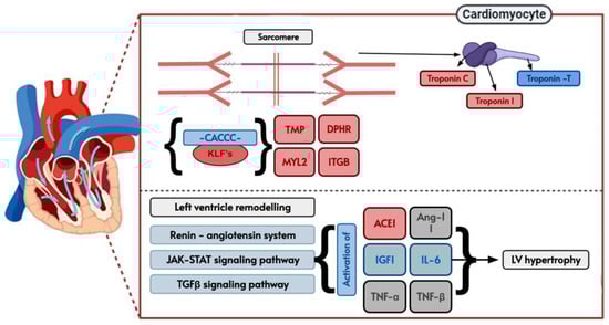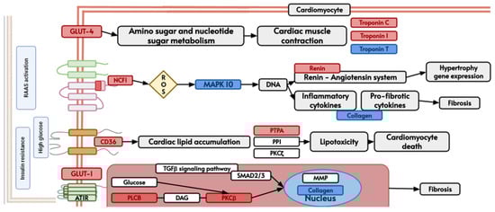 ShinyGO analysis directly links to the Kyoto Encyclopedia of Genes and Genomes (KEGG) database (https://www.genome.jp/kegg/pathway.html, accessed on 22 October 2023), to directly visualize gene interaction in the cell [28]. As a representation of cardiac disease involvement, we present in Figure 5 a schematic depiction of hypertrophic cardiomyopathy [29] and in Figure 6 of diabetic cardiomyopathy [30]. Blue-colored genes represent KLF-confirmed interacting genes, while red-colored represents the general 1174 (CACCC-motif) genes. Furthermore, to show direct protein–protein (KLF) interaction, a STRING (12.0) analysis was run for both diseases (Supplementary Figure S2). For hypertrophic cardiomyopathy, the analysis showed a direct interaction, specifically co-expression and text mining, between IL-6 and KLF-2, KLF-4, and KLF-6. Similarly, IL-6 also directly interacts with TNNT2, TNNI3, and ACE, suggesting the potential for indirect interactions mediated by IL-6, KLFs, and genes related to the sarcomere.