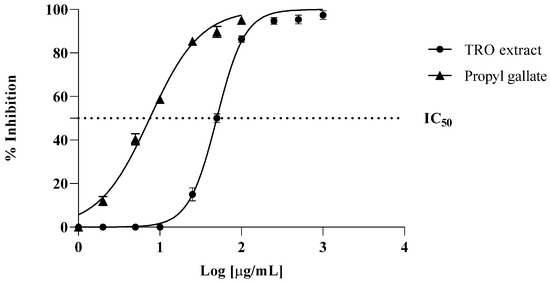 As can be seen in Figure 1, the protective action of TRO against MDA production was strong, with an IC50 value of 50 μg/mL, although it was lower than the propyl gallate used as a positive control, which showed an IC50 value of 7 μg/mL. IC50 value (μg/mL) was also calculated by testing different concentrations of the extract. These results corroborate our FRAP results, also reported in this study, indicating that Tropea red onion outer scales are rich in antioxidant metabolites.