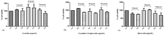 The efficacy of cyanidin, cyanidin-3-O-glucoside and quercetin on Caco-2 to cell viability is shown in Figure 2. A concentration of 50 μg/mL of cyanidin produced a slight increase in cell viability at both 24 and 72 h treatments, while cell exposure to cyanidin-3-O-glucoside or quercetin did not affect cell viability at the times and concentrations used.