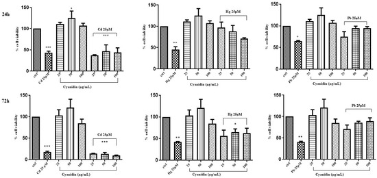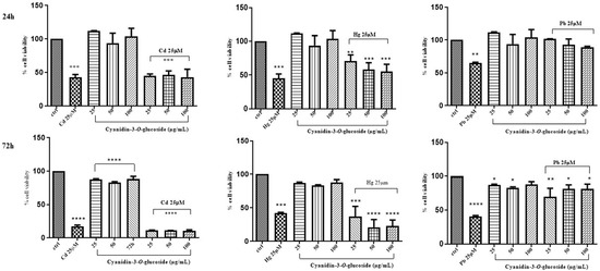 Effect of simultaneous treatment with CdCl2, HgCl2, or PbCl2 and cyanidin on Caco-2 cell viability after 24 h and 72 h of exposure (MTT assay). The mean ± SEM (n = 3) is used to express the data. Significant differences versus control * p < 0.05, ** p < 0.01, *** p < 0.001, **** p < 0.0001, whereas non-significant differences are not shown.