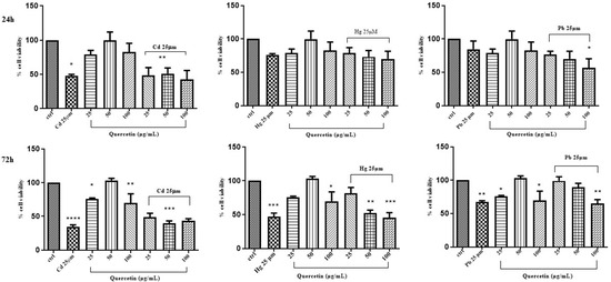 Effect on Caco-2 cell viability of the simultaneous exposure (24 h and 72 h) to CdCl2, HgCl2, or PbCl2 and quercetin (MTT assay). The mean ± SEM (n = 3) is used to express the data. Significant differences versus control * p < 0.05, ** p < 0.01, *** p < 0.001, **** p < 0.0001, whereas non-significant differences are not shown.