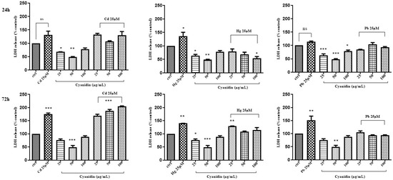 LDH activity of Caco-2 cells after 24 h and 72 h treatment with different concentrations of cyanidin and CdCl2, HgCl2, or PbCl2. The mean ± SEM (n = 3) is used to express the data. Significant differences versus control * p < 0.05, ** p < 0.01, *** p < 0.001, **** p< 0.0001, whereas non-significant differences are not shown.