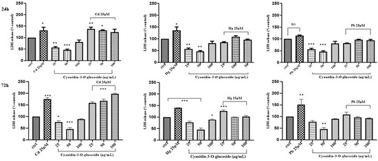 LDH activity of Caco-2 cells after 24 h and 72 h treatment with different concentrations of cyanidin-3-O-glucoside and CdCl2, HgCl2, or PbCl2. The mean ± SEM (n = 3) is used to express the data. Significant differences versus control * p < 0.05, ** p < 0.01, *** p < 0.001, **** p < 0.0001, whereas non-significant differences are not shown.