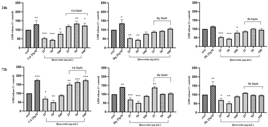 LDH activity of Caco-2 cells after 24 h and 72 h treatment with different concentrations of quercetin and CdCl2, HgCl2, or PbCl2. The mean ± SEM (n = 3) is used to express the data. Significant differences versus control * p < 0.05, ** p < 0.01, *** p < 0.001, **** p < 0.0001, whereas non-significant differences are not shown.