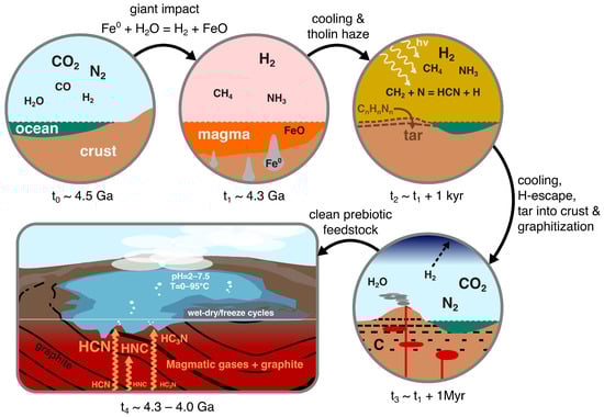 A schematic representation of the scenario we propose here for clean, high-yield production of prebiotic feedstock. Events move around clockwise from the top left: First, the Earth has a neutral atmosphere. This is reduced following a giant impact at 4.3 Ga by oxidation of the impactor’s metal core to produce a massive H2 atmosphere with significant methane and ammonia. This atmosphere quickly cools (in <1 kyr), with photochemistry producing a tholin-rich haze that deposits complex nitrogen-rich organics. These organics become progressively buried and graphitized by interaction with magma. The atmosphere clears as H2 is lost to space and becomes neutral again. Finally, magmatic gases interact with the graphite and are scrubbed to produce high yields of clean HCN, HC3N, and isonitriles.