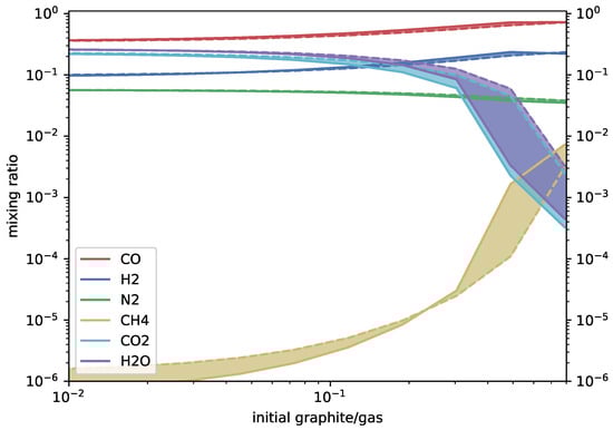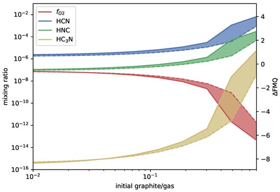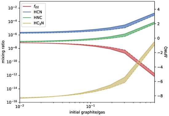 We will now model the latter part of this scenario: the interaction of gas initially in equilibrium with magma (i.e., one log unit below the quartz–magnetite–fayalite buffer in terms of its oxygen fugacity) as it flows through graphite. We start with a fiducial model at , 100 bar gas at QFM, plus a fixed nitrogen content of . Graphite is added to the system. QFM conditions are incorporated by setting initial conditions to the values from Table 1.
