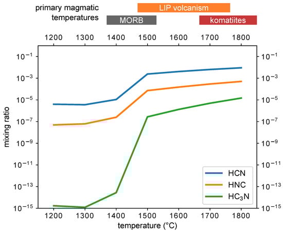 Mixing ratios of HCN, HNC, and HC3N (y-axis) at graphite saturation as a function of temperature (C, x-axis) for a magmatic gas starting at QFM with elemental nitrogen content held at . Only the kinetics results are shown. Indicative eruptive temperatures of terrestrial magmas are given above the plot: ‘MORB’ = mid-ocean ridge basalts [51], ‘LIP’ = large igneous province [51], and komatiite temperatures are given for Archean-age examples [43].