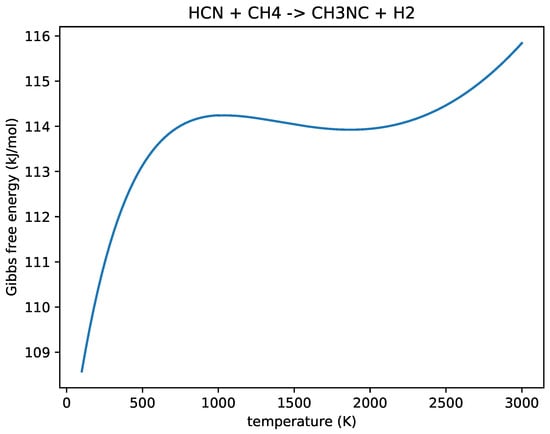 The Gibbs free energy of the reaction: (kJ/mol) as a function of temperature (K). We can see that for all temperatures, this formation reaction for CH3NC is endergonic, but not strongly so.