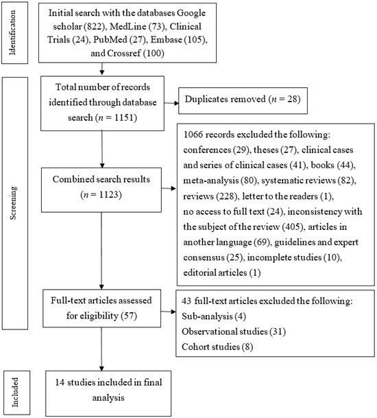 During the systematic search, we found a total of 1151 records. After adjustment for duplicates, 1123 records remained. After screening of the title and the abstract, 1066 records were excluded. The main reason for the exclusion of 24 articles was that we did not have full-text access and that they were not randomized control trials according to their abstract. After a full-text review, 14 randomized control trials met the inclusion criteria for the present systematic review. A PRISMA flow diagram of study selection is shown in Figure 1. Main characteristics of included studies are shown in Table 1.