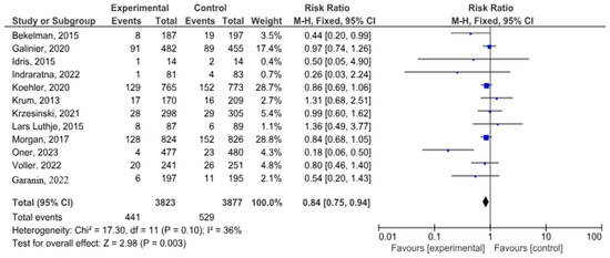 In a meta-analysis devoted to all-cause mortality in patients with HF, 12 studies were included with a total of 7700 patients. Almost half of these patients underwent telemonitoring—3823 (49.6%). All-cause death happened in 441 patients with telemedicine support and in 529 patients without telemedicine support (risk ratio 0.84, 0.75–0.94, p = 0.003; I2 = 36%) (Figure 2).