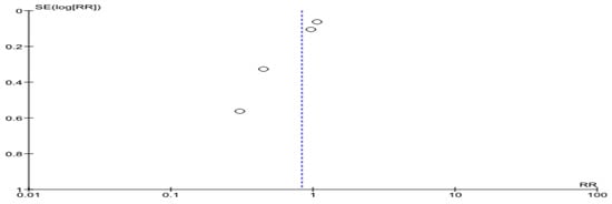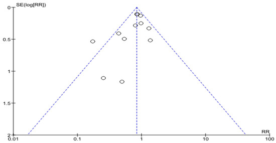 The funnel plot is shown in Figure 3. We can see the variation in the size of the effects for patients in the presented RCTs relative to the axis of the central trend. There is also some asymmetry of the funnel-shaped scattering diagram with a significant number of studies included in the analysis.