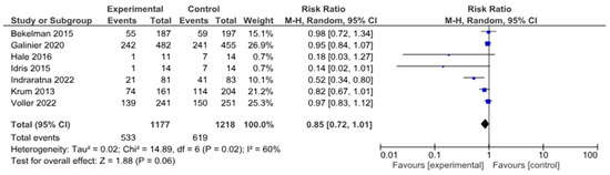 In a meta-analysis devoted to all-cause hospitalizations in patients with HF, seven studies were included with a total of 2395 patients. Almost half of them underwent telemonitoring—1177 (49.1%). All-cause hospitalizations happened in 533 patients with telemedicine support and in 619 patients without telemedicine support (risk ratio 0.85, 0.72–1.01, p = 0.06; I2 = 60%) (Figure 4).