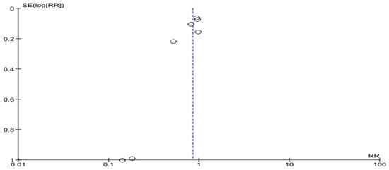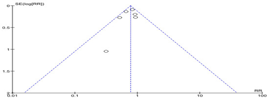 The funnel plot is shown in Figure 7. There was also a variation in the size of the effects for patients in the presented RCTs relative to the axis of the central trend, a significant asymmetry of the diagram with a small number of studies.