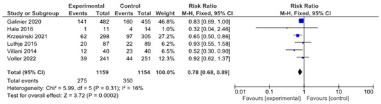 In a meta-analysis devoted to HF-related hospitalizations, six studies were included with a total of 2313 patients. Half of them underwent telemonitoring—1159 (50.1%). HF-related hospitalizations happened in 275 patients with telemedicine support and in 350 patients without telemedicine support (risk ratio 0.78, 0.68–0.89, p = 0.0002; I2 = 16%) (Figure 6).