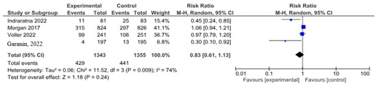 In a meta-analysis devoted to cardiovascular disease-related hospitalizations, four studies were included with a total of 2698 patients. Half of them underwent telemonitoring—1343 (49.8%). Cardiovascular disease-related hospitalizations happened in 429 patients with telemedicine support and in 441 patients without telemedicine support (risk ratio 0.83, 0.61–1.13, p = 0.24; I2 = 174%) (Figure 8).
