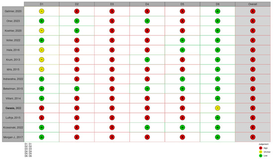 The assessment of the risk of bias of the included randomized control trials was carried out in accordance with Cochrane Collaboration’s tool for assessing the risk of bias. Overall, 7 studies had a random sequence generation, 3 studies featured allocation concealment, none of the studies featured blinding of patients and personnel, 4 studies utilized blinding of outcome assessment, 5 studies had incomplete outcome data, and 13 studies had selective reporting. In total, all of the studies had a high risk of bias (Figure 10 and Figure 11).