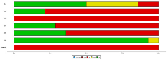 Assessment of the risks of bias of the included RCTs. D1, random sequence generation; D2, allocation concealment; D3, blinding of patients and personnel; D4, blinding of outcome assessment; D5, incomplete outcome data; D6, selective reporting [15,16,17,18,19,20,21,22,23,24,25,26,27,28].