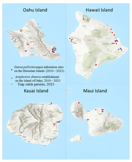 Map of major infestation sites, parasitoid colonization, and establishment on the Hawaiian Islands (sizes of the islands are not in scale). Sampling locations with GPS coordinates are shown in Tables. (Oahu Island GPS coordinates of 21°18′56.1708″ N, 157°51′29.1348″ W; Hawaii Island with the GPS coordinates of 19°44′30.3180″ N, 155°50′39.9732″ W; Kauai Island with GPS coordinates of 22°6′30.7548″ N, 159°29′48.3540″ W.; Maui Island with GPS coordinates of 20°47′54.1068″ N and 156°19′54.9264″ W. [https://www.latlong.net (accessed on 13 December 2023)].