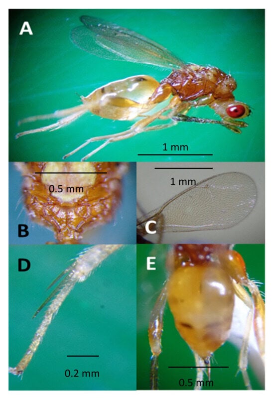 Aroplectrus dimerus (A) female side habitus, curved down mesosoma in profile along the dorsal margin, overall body color yellow and reddish, scape longer than eye, head narrower than mesosoma, smooth hind coxae; (B) scutellum finely granulate with longitudinal carinae, propodeum, median carina weak, submedian areola divided completely into two sectors by a continuous oblique carina; (C) forewing hyaline, densely pilose veins brownish wing post-marginal vein longer than stigmal vein; (D) elongate metatibial spur longer than basitarsus, not reaching apex of second tarsal segment; (E) gaster, female metasoma shorter and narrower than mesosoma, oblong-ovate in dorsal view unicolor, gaster showing dark bands and black ovipositor sheath, ovipositor exerting beyond abdominal apex, smooth hind coxae (pictures taken using MMR).